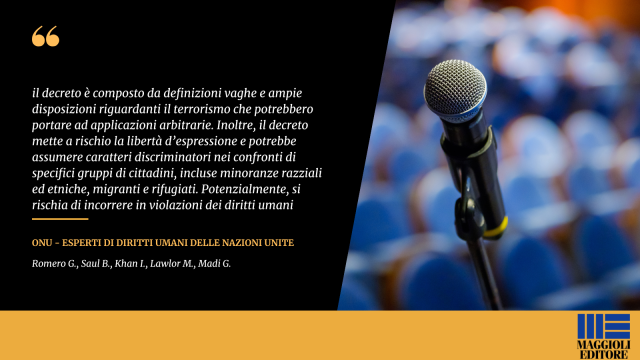 - Abuso della decretazione d’urgenza: Poiché, per unanime giudizio dei giuristi finora espressisi, nessun fatto nuovo configurabile come «casi straordinari di necessità e di urgenza» ai sensi dell’art. 77, comma secondo, Cost. è occorso tra la discussione alle Camere del d.d.l. sicurezza e la scelta di trasformarlo in un decreto legge dal medesimo contenuto, da più parti si sono manifestate severe perplessità anzitutto sulla (in)sussistenza dei presupposti giustificativi per il ricorso alla decretazione d’urgenza, tanto più che neppure il governo proponente si era mai avvalso della facoltà, prevista dall’art. 72 Cost. e dai regolamenti parlamentari, di chiedere l’esame con procedura d’urgenza di quel disegno di legge.