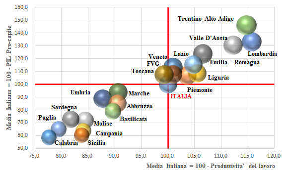 Si consideri, infatti, che la totalità delle regioni dell’Italia del Nord, si connota per un livello di PIL pro – capite e, della Produttività del lavoro ampiamente superiore alla media italiana, grafico 1.