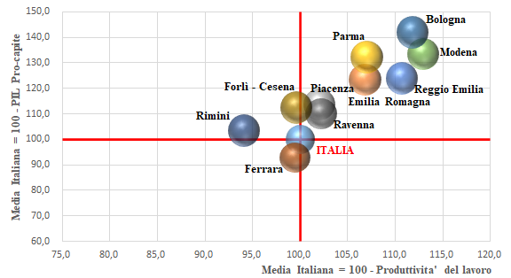 Com’è noto, il sistema economico dell’Emilia – Romagna non manifesta il dualismo, che invece, distingue quello italiano. La quasi totalità delle province della stessa Regione, infatti, sperimenta un livello del PIL pro – capite marcatamente superiore alla media italiana. Ciò a motivo, chiaramente, di un livello della Produttività del lavoro e, del Tasso di occupazione superiori, grafico 2.