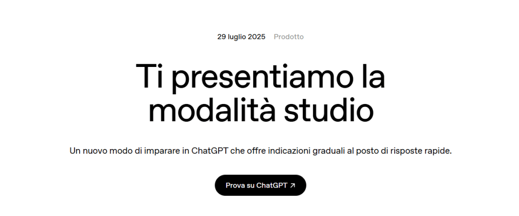 Il 29 luglio, dopo aver debuttato negli Stati Uniti, ChatGPT rende disponibile una nuova funzionalità: “studia e impara”, usufruibile attraverso tutti i piani d’abbonamento (fin da quelli gratuiti). La nuova versione è stata sviluppata insieme a scienziati, docenti e pedagogisti per rispondere a chi accusava le nuove tecnologie di sfavorire l’apprendimento e rallentare l’istruzione.