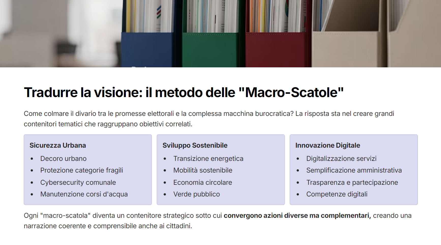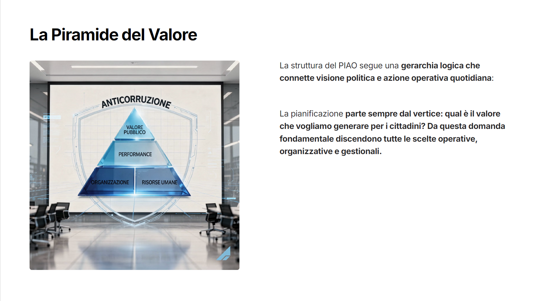 In questa puntata scopriremo perchè la politica è al centro di questo strumento e deve guidarlo assieme all’organizzazione, capiremo cos’è il Valore Pubblico e dove si deve cercare, come aiutarsi a definire gli obiettivi con il metodo delle “Macro Scatole” di cui vi forniremo pratici esempi e come aiutare i cittadini a comprendere il contenuto del Piano.