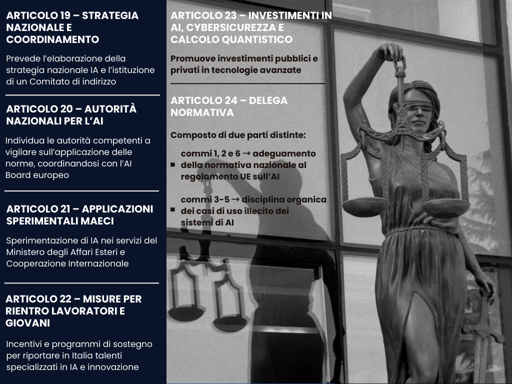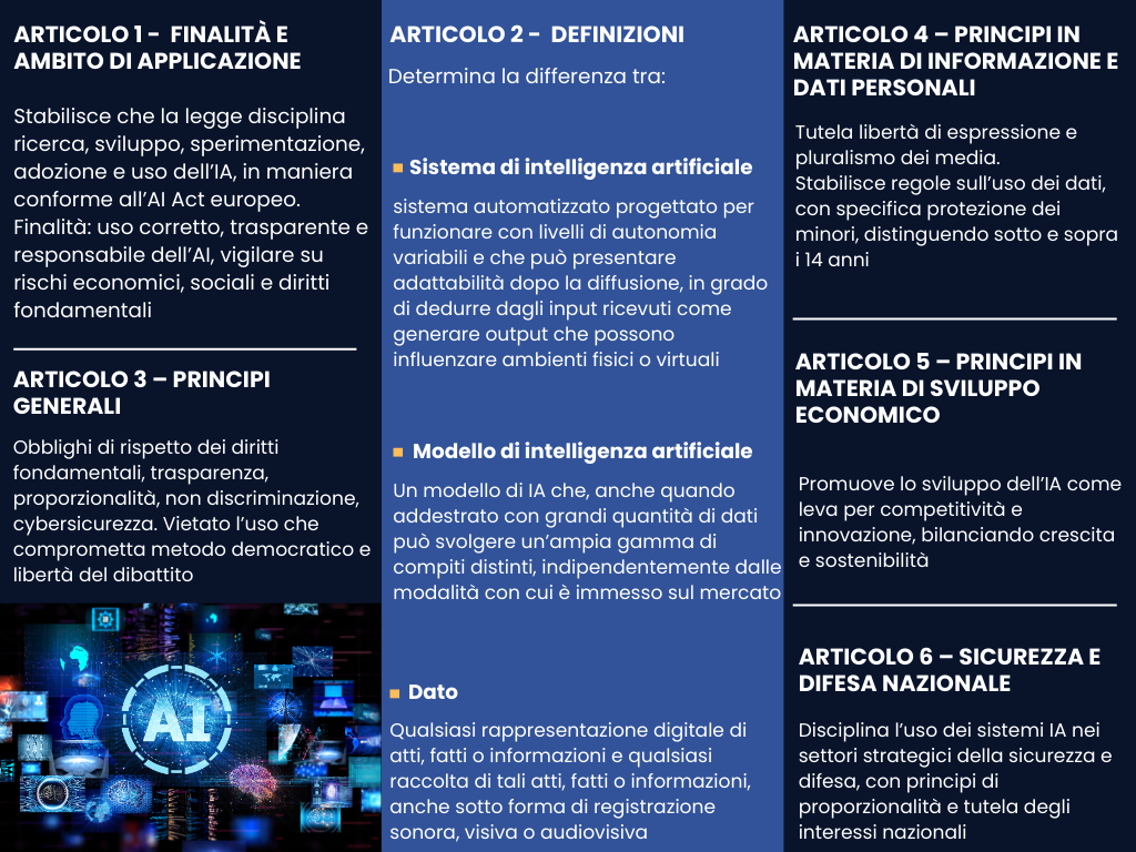 Nella seduta del 17 settembre 2025, il Senato ha approvato in via definitiva il disegno di legge n. 1146-B recante: “Disposizioni e delega al Governo in materia di intelligenza artificiale” con cui si introduce la prima normativa nazionale che regola l’utilizzo e i limiti dell’intelligenza artificiale. Il provvedimento, prossimo alla pubblicazione, è composto da 28 articoli, articolati in 6 sezioni; sviscera i principi alla base di questo strumento e norma i diritti di chi ne usufruisce.