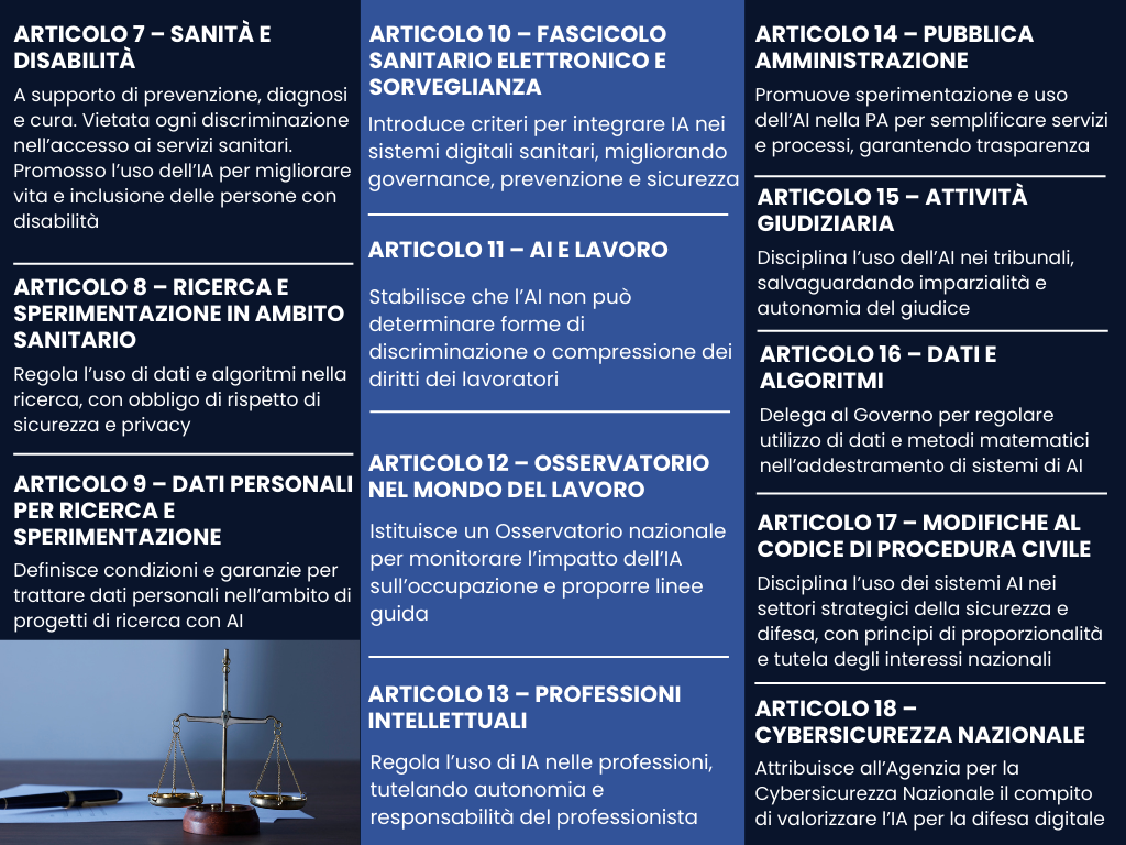 Il secondo capo dei 6 che formano la legge si dedica a un delicato ambito di applicazione, fortemente discusso, dell’intelligenza artificiale: nel settore sanitario, i sistemi di AI potranno supportare diagnosi e terapie, e, anche qui, la parola “supportare” evidenzia il punto cardine della legge: niente, specialmente in ambiti così pericolosamente variabili, può sostituire la decisione umana; in questo caso, la decisione clinica che resta in capo al medico. Si ribadisce che è esplicitamente vietato ogni uso discriminatorio nell’accesso alle cure. La ricerca scientifica in campo medico e l’integrazione nei sistemi digitali sanitari sono incentivate, purché rispettose della riservatezza dei dati. Sul fronte del lavoro, la legge tutela i diritti dei dipendenti e istituisce un Osservatorio nazionale per monitorare l’impatto occupazionale dell’AI. Infine, nel settore giudiziario l’AI potrà essere utilizzata come supporto organizzativo e gestionale, e, di nuovo, mai in sostituzione del giudice.