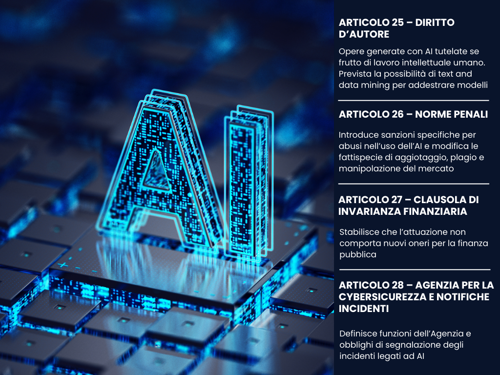 Il diritto d’autore gode dello stesso ineludibile principio: la tutela ancorata al contributo umano. L’articolo 25 norma la tutela delle “opere dell’ingegno”: un’opera generata interamente da un sistema di AI non gode di protezione autonoma, mentre quelle realizzate con l’ausilio di algoritmi, ma sotto la direzione intellettuale di un autore, continuano a essere considerate opere protette. In parallelo viene inoltre consentita la riproduzione e l’estrazione da opere o da altri materiali contenuti in rete o in banche di dati cui si ha legittimamente accesso, effettuata tramite l’utilizzo di modelli e sistemi di intelligenza artificiale, compresi quelli generativi, in conformità a talune disposizioni della medesima legge n. 633 del 1941.