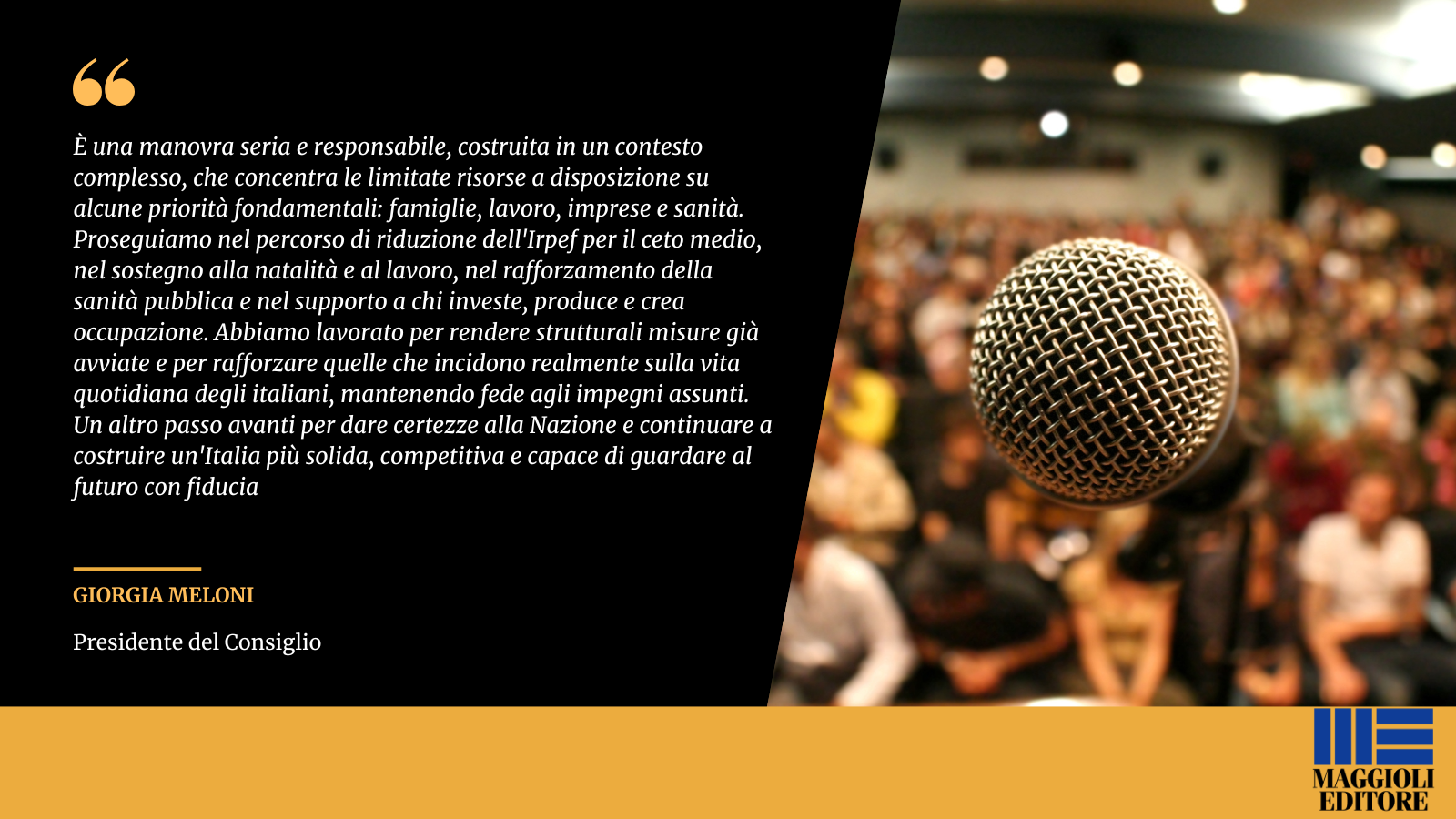 È stata pubblicata ufficialmente la Legge di Bilancio in Gazzetta Ufficiale dopo che il 30 dicembre 2025 è stato approvato ufficialmente il testo della Legge di Bilancio 2026 approdato all’ultimo passaggio del lungo iter: la Camera. I 216 favorevoli hanno dato fiducia al testo vagliato dal Senato che propone misure per un totale di 22,2 miliardi di euro. I 126 contrari e 3 astenuti hanno mosso parecchie critiche alla prossima Manovra Finanziaria, sono succedute varie proteste in aula, ma la Legge è stata approvata dalla Camera dei deputati senza modifiche rispetto al testo già licenziato dal Senato. Le misure saranno in vigore a partire dal primo gennaio 2026.